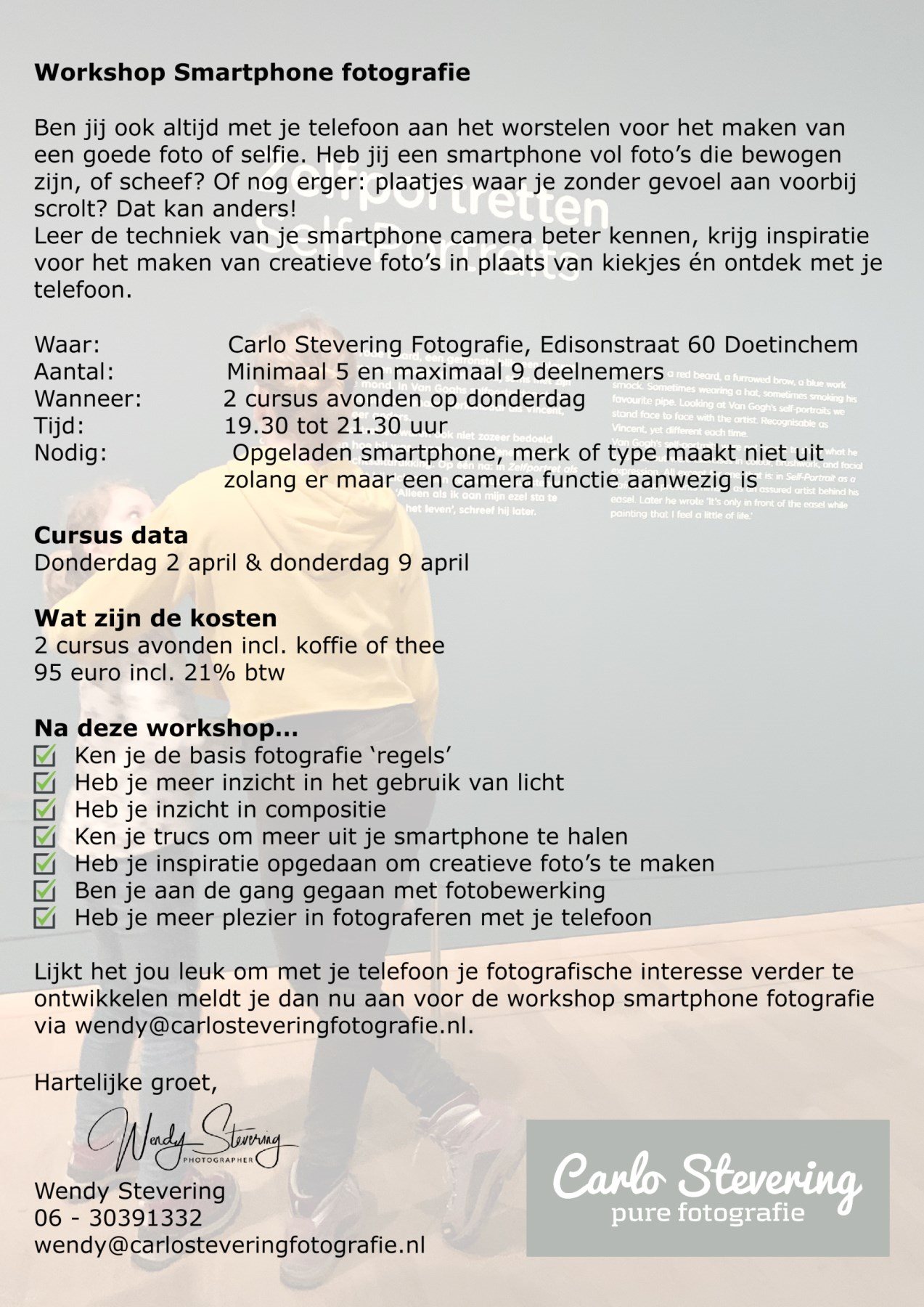Lijkt het jou leuk om met je telefoon je fotografische interesse verder te ontwikkelen meldt je dan nu aan voor de workshop smartphone fotografie via wendy@carlosteveringfotografie.nl.