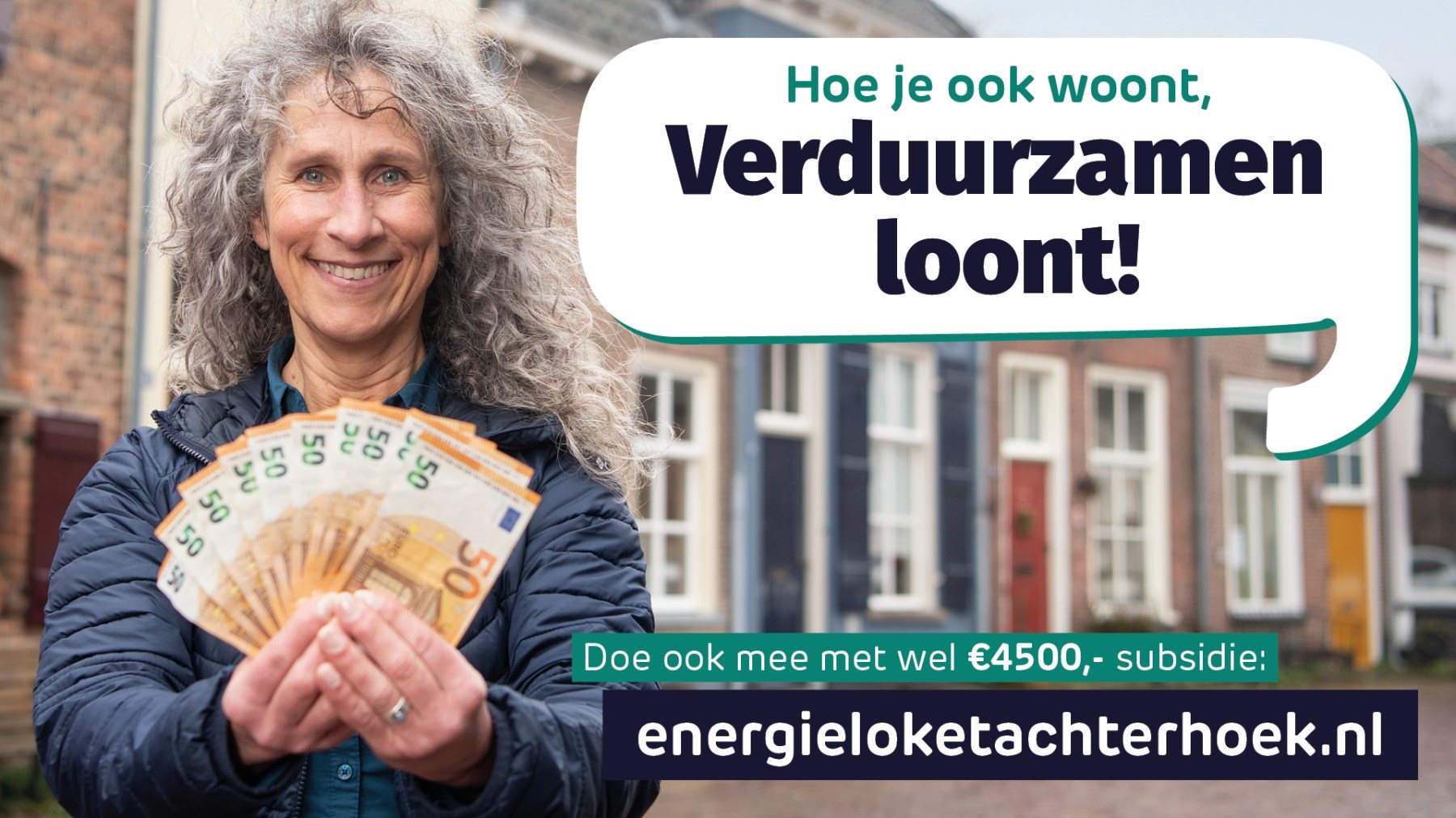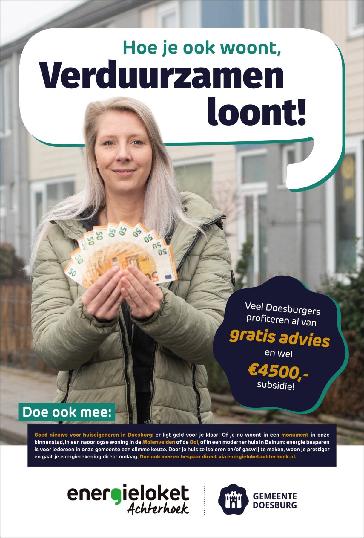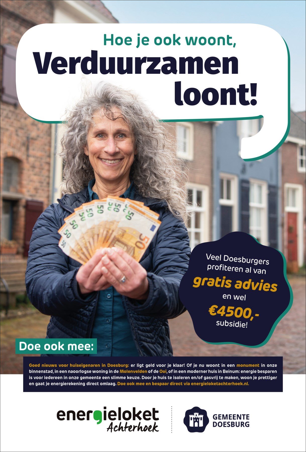 Een klein, maar krachtig detail: de modellen met geld in hun hand. Simpel, maar doeltreffend. Een visuele vertaling van de subsidie, die in één oogopslag duidelijk maakt waar de campagne over gaat.