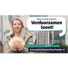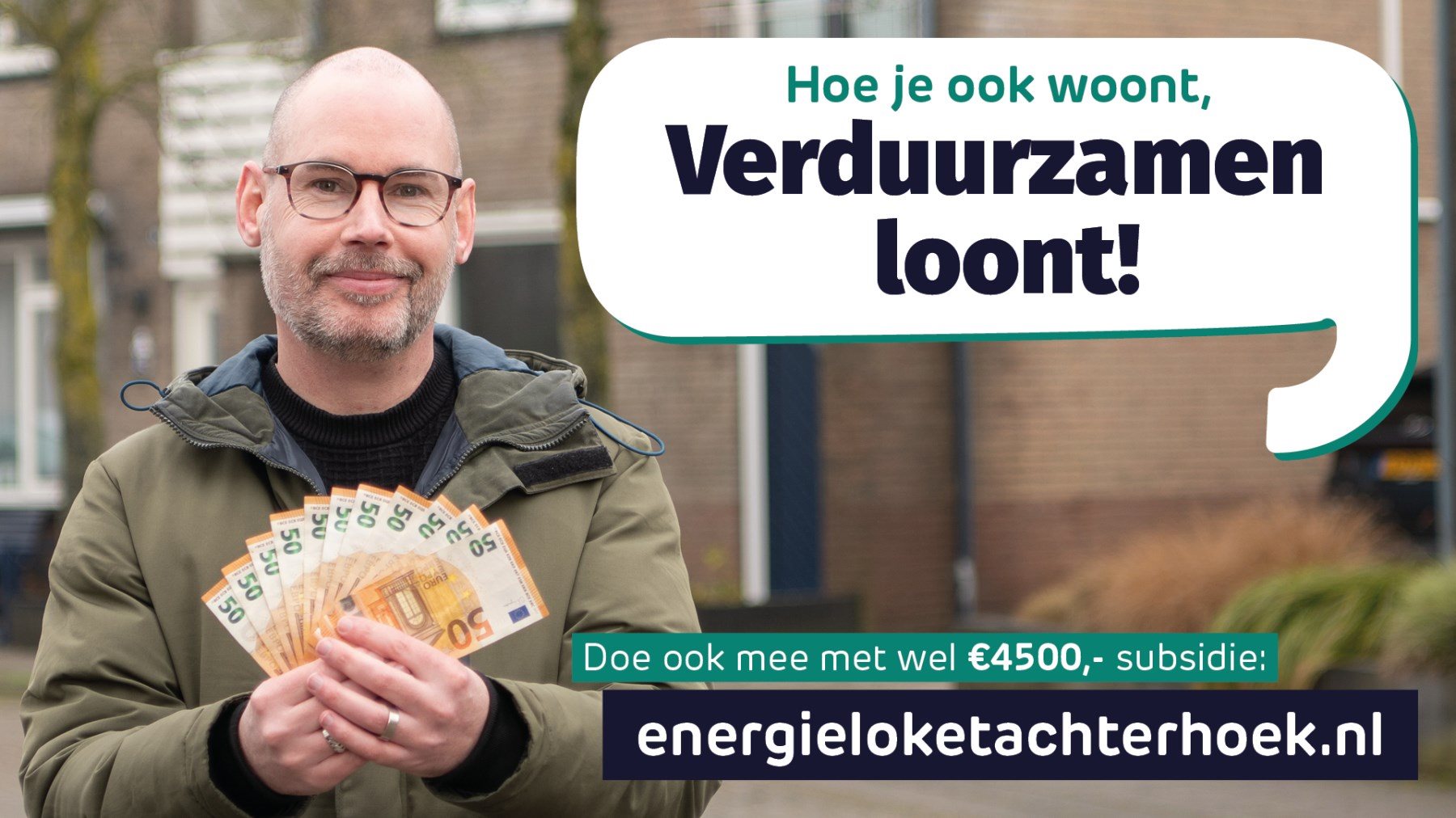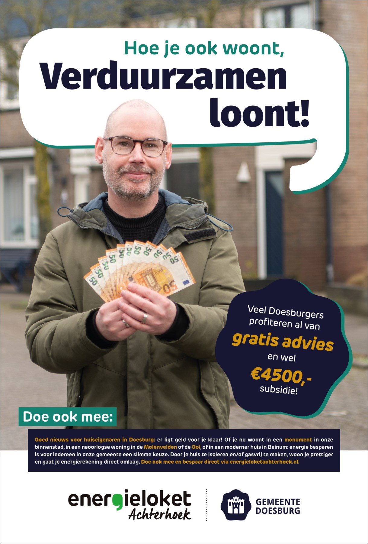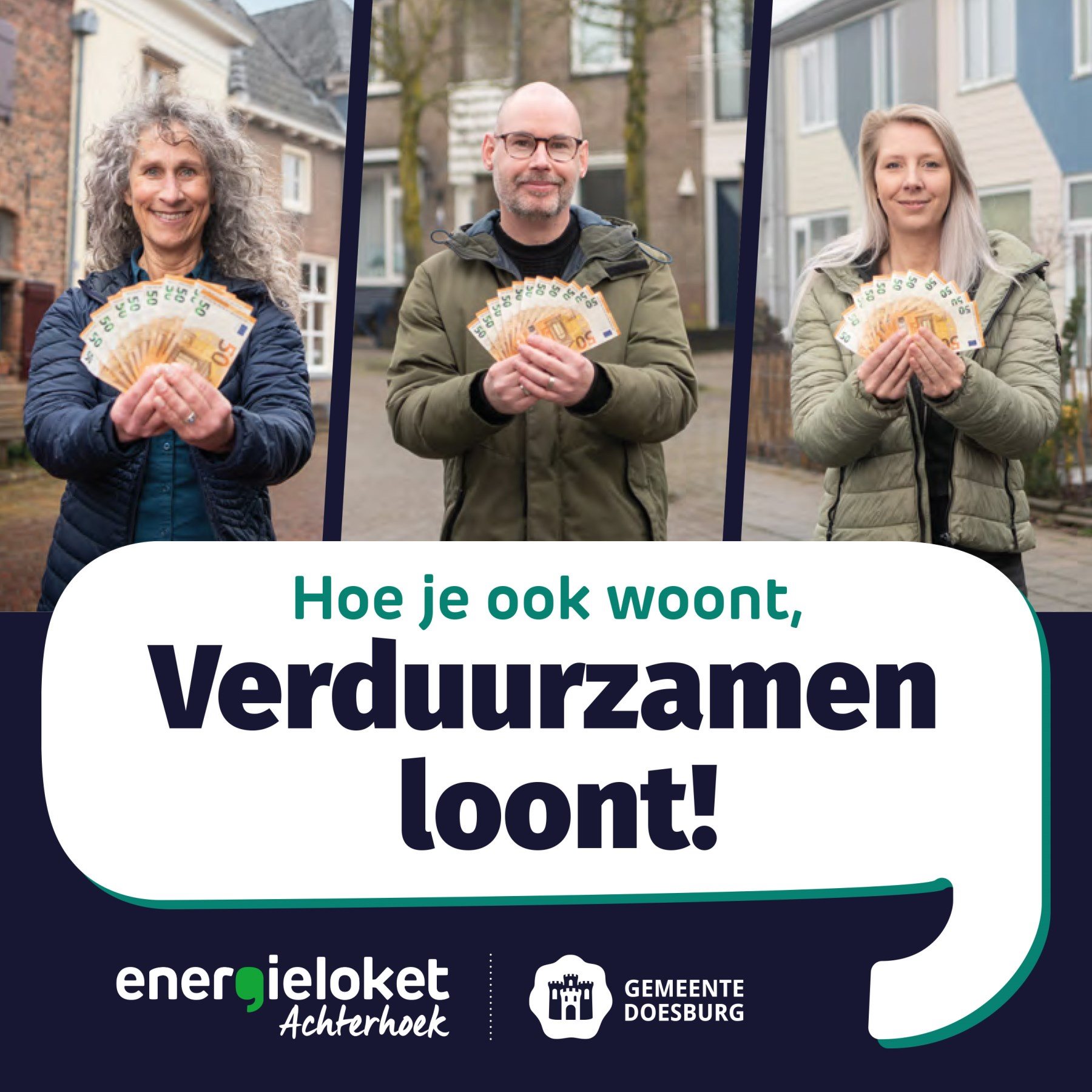 Een klein, maar krachtig detail: de modellen met geld in hun hand. Simpel, maar doeltreffend. Een visuele vertaling van de subsidie, die in één oogopslag duidelijk maakt waar de campagne over gaat.