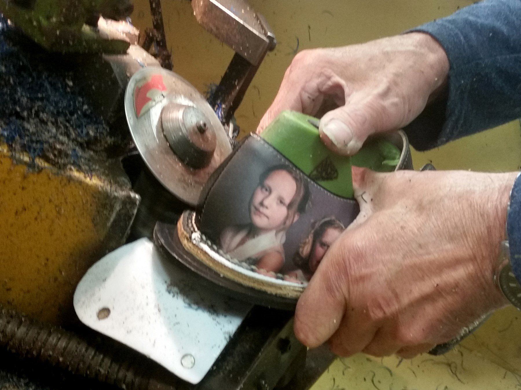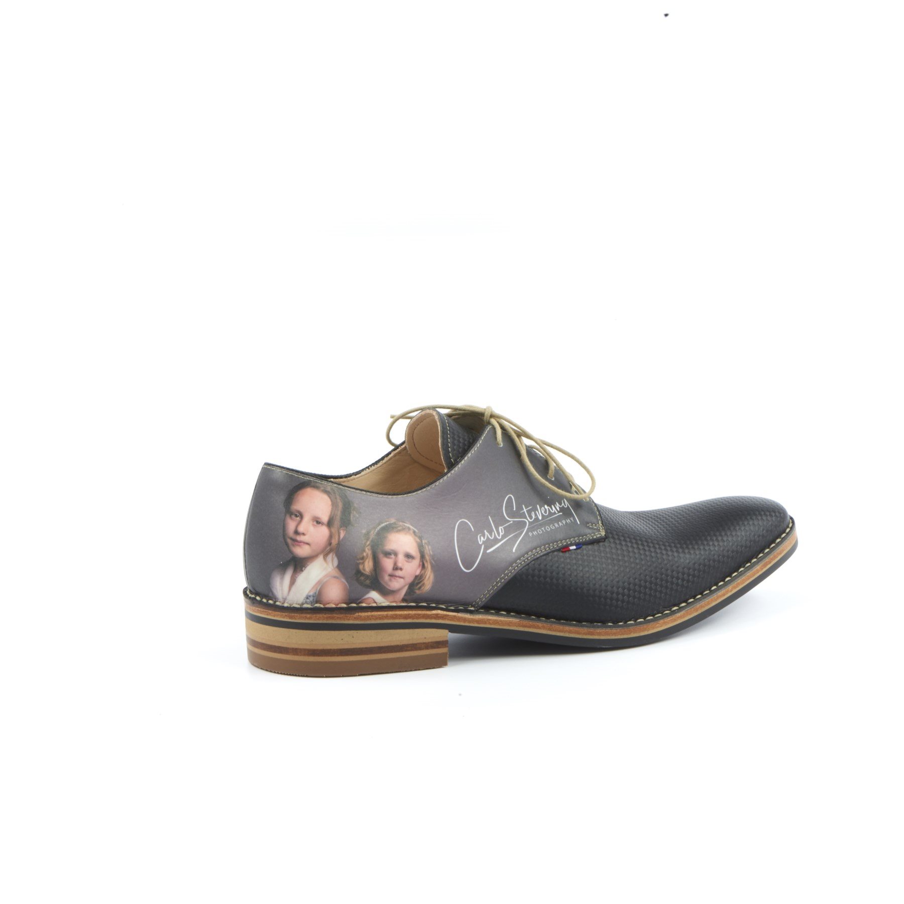 De foto op de schoen is uiteraard door Carlo Stevering Fotografie zelf gemaakt. De complete foto is inclusief zijn handtekening in photoshop bewerkt en bij Kops Schoenen aangeleverd. De beide dochters zijn er erg trots op dat papa nu paradeert met hun portret.